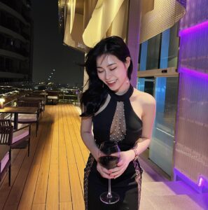 แต่งหน้าเบา ๆ ปากแก้มอมชมพู ตาใส่คอนเทคเลนส์เพิ่มมิติ วงแขนเรียบเนียน